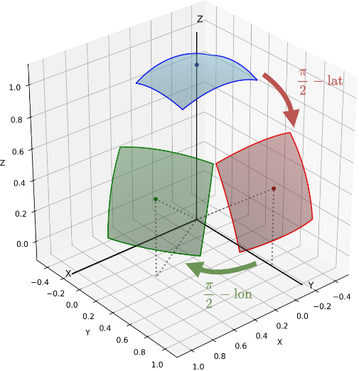 # x軸周りに -(pi/2-lat) 回転 rx = np.array([[1, 0, 0], [0, np.sin(lat), np.cos(lat)], [0, -np.cos(lat), np.sin(lat)]]) # z軸周りに -(pi/2-lon) 回転 rz = np.array([[np.sin(lon), np.cos(lon), 0], [-np.cos(lon), np.sin(lon), 0], [0, 0, 1]]) xyz = xyz.reshape([height * width, 3]).T xyz = np.dot(rx, xyz) xyz = np.dot(rz, xyz)