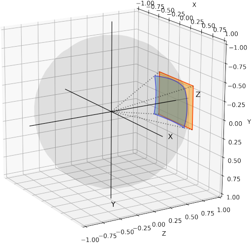 \(Z=1\)平面への射影 (橙の平面に合うようにスケーリングする)