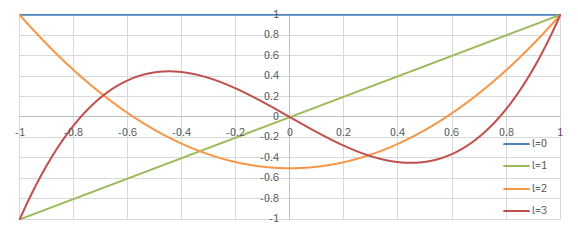 更に、\(P_l(1)=1\)という条件を課すと\(a_0=1\)となり、このような多項式をLegendre多項式と呼ぶ。