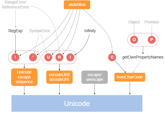 atob/btoaはECMAScriptで定義された関数ではなく、Webブラウザー環境向けの機能としてWHATWG HTML Living Standardで定められたJSのAPIの一つである。したがって、これらの関数は全てのJSの実装で利用できるわけではないことに注意が必要。(Node.jsのようなWebブラウザーではないJS環境では使えない)